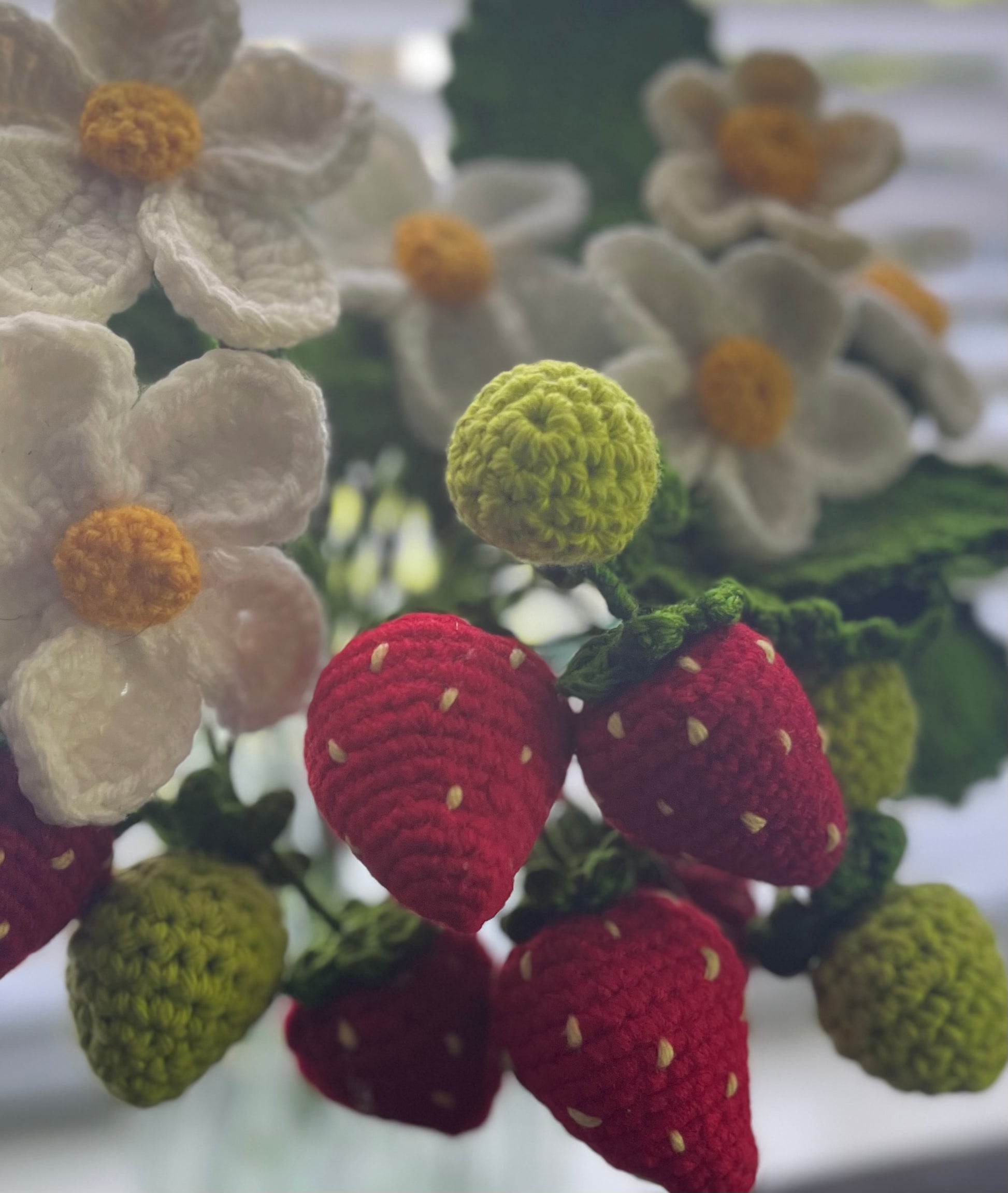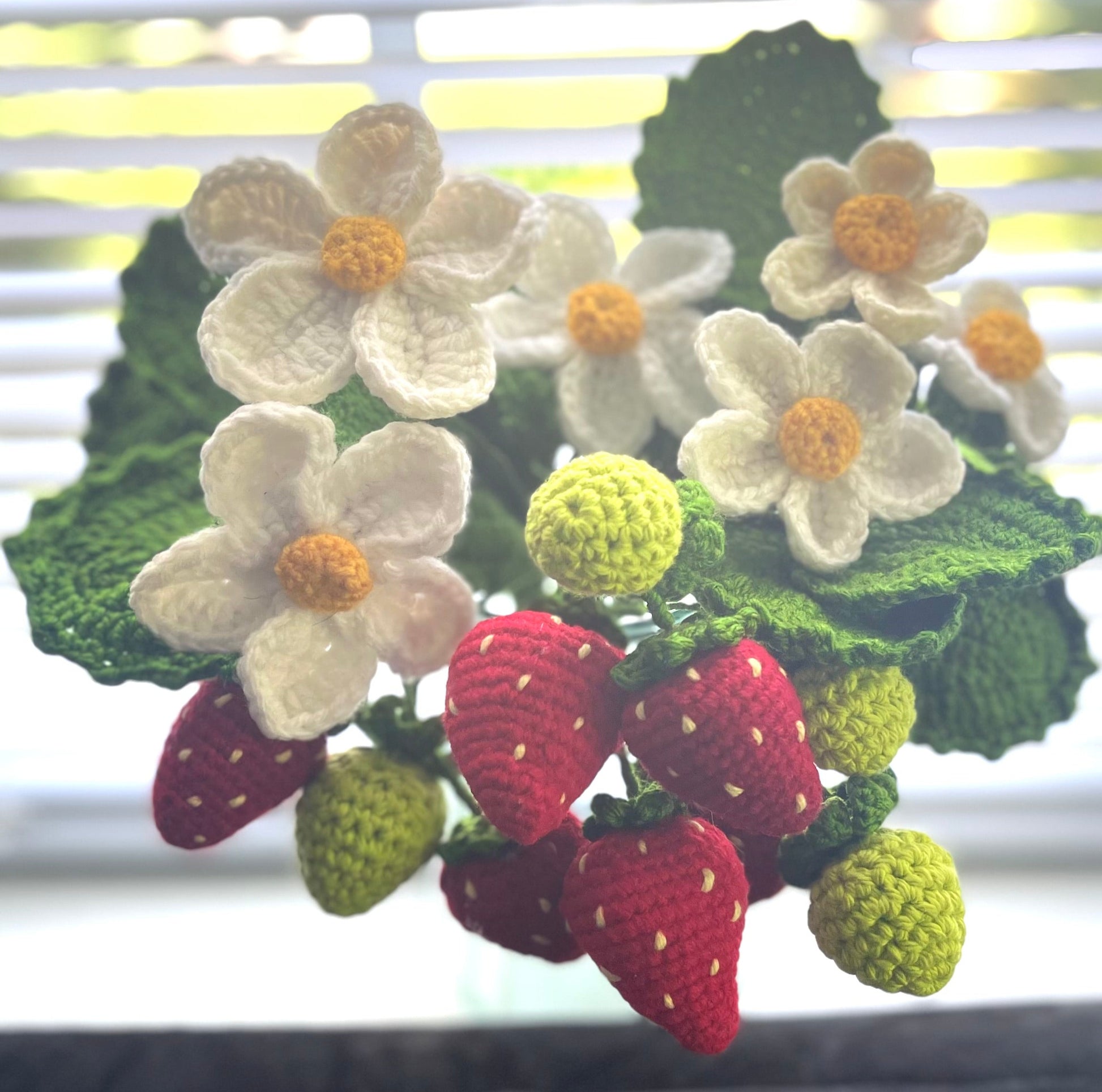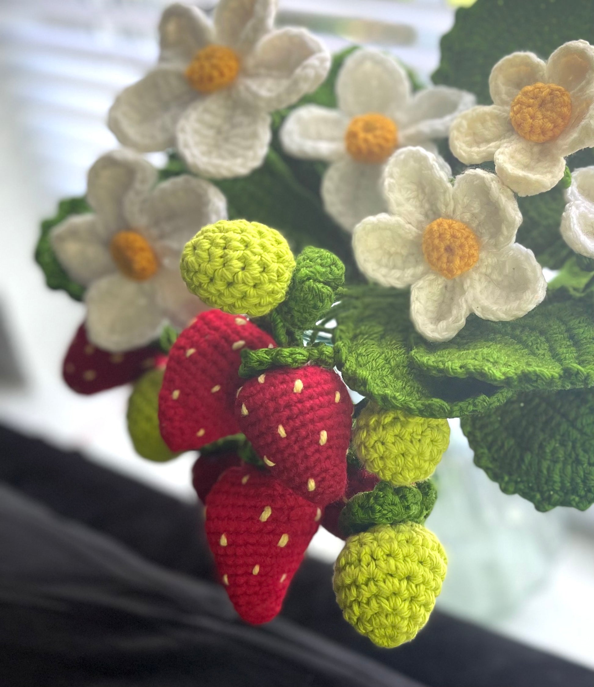 Add a sweet and cheerful touch to your space with this charming handmade crochet strawberry plant, complete with: