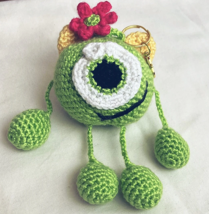 Bring a little monster magic wherever you go with this Handmade Crochet Monsters-Inspired Keychain! This adorable green creature is crafted with love and features a single big eye (white with black detailing), soft green body, and a feminine twist—a charming pink bow that adds the perfect playful touch.